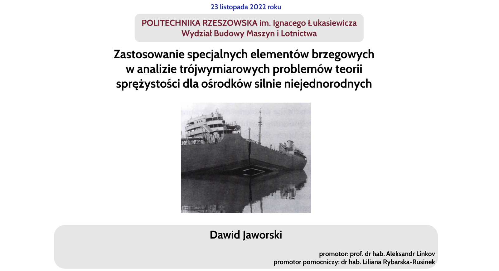 Z przyjemnością informujemy, że 30 listopada 2022 r. Rada Dyscypliny Inżynieria Mechaniczna Politechniki Rzeszowskiej im. Ignacego Łukasiewicza nadała naszemu pracownikowi, mgr. inż. Dawidowi Jaworskiemu, stopień doktora w dziedzinie nauk inżynieryjno-technicznych w dyscyplinie inżynieria mechaniczna.